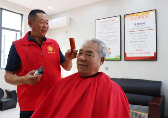 “这就是俺村的爱心理发室,理发师黄师傅是老村民了,理发室开了后,他有这个手艺,就主动来做志愿者了,每个月定期给村里的老人理发。隔壁是下棋的地方,那边还有小孩儿玩的,这都是免费哩。村里还开的有大食堂、爱心超市,能用积分去吃饭、买东西……这生活上的需求现在基本不用出村都行,可方便了。”75岁老党员杨海青一直等着其他老人理完发后才上前准备理发。